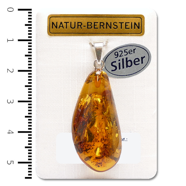 Bernstein-Anhänger Tropfen 'L' an Silberöse auf Dekokarte