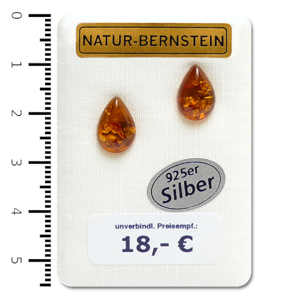 Bernstein-Ohrstecker, Tropfen, ungefasst mit 925er Silber Stecker, cognac, auf Dekokarte