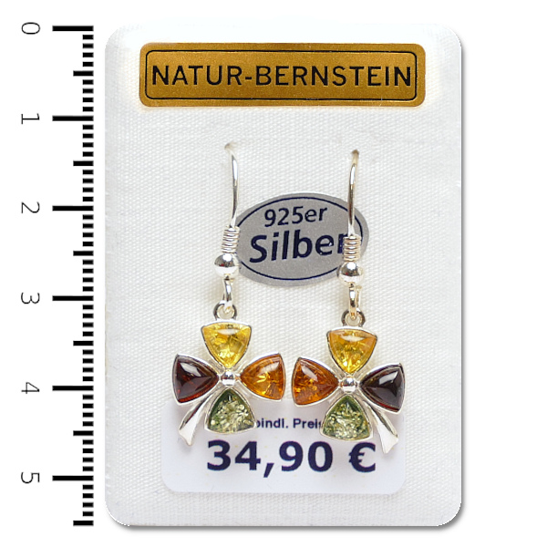 Bernstein Ohrstecker, multicolor, in 925er Silber Fassung, auf Dekokarte