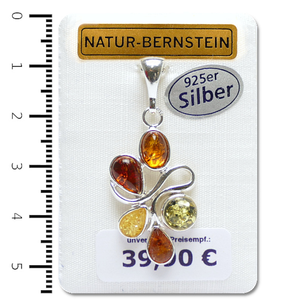Bernstein-Anhänger "Phantasie" aus 925er Silber, multicolor, auf Dekokarte
