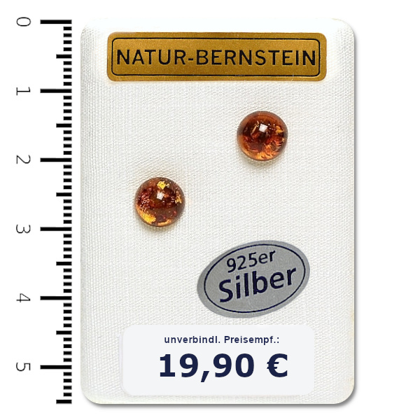 Bernstein-Ohrstecker, rund ca. 7 mm ø, ungefasst mit 925er Silber Stecker, cognac, auf Dekokarte